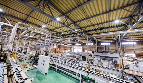 側面ユニット、木口ユニットを並列配置し、量産化を可能にしたラインです。多軸加工機も備え、狭小地物件にも柔軟に対応します。
