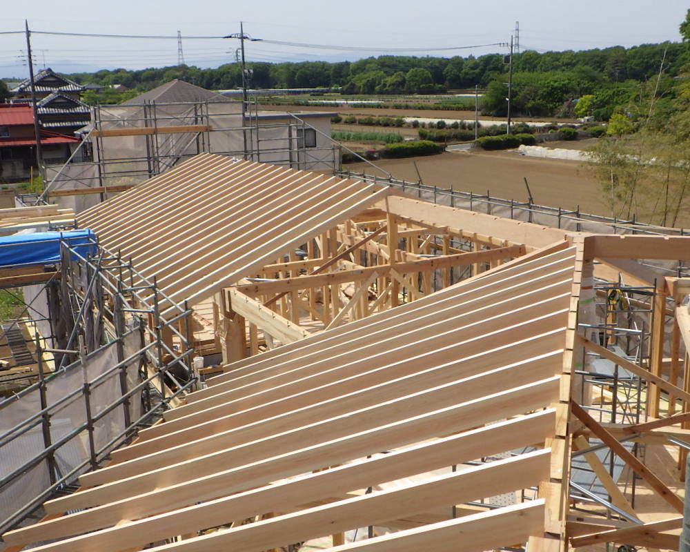 大黒柱につながる振れ隅木・谷木の加工は手加工大工の腕の見せどころです。